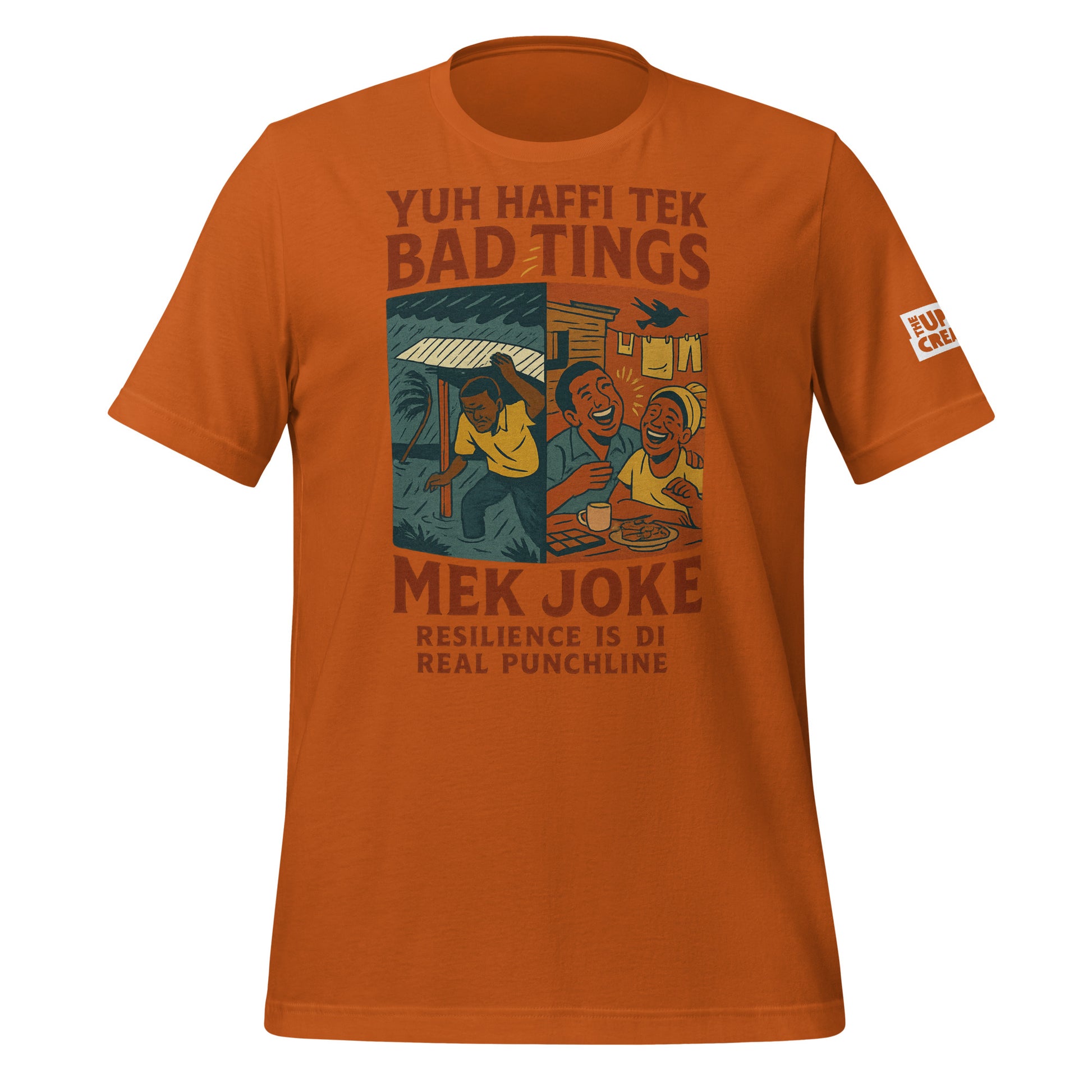 This tee captures our signature Caribbean resilience: zinc roof stress on one side, belly-buss joy on the other.